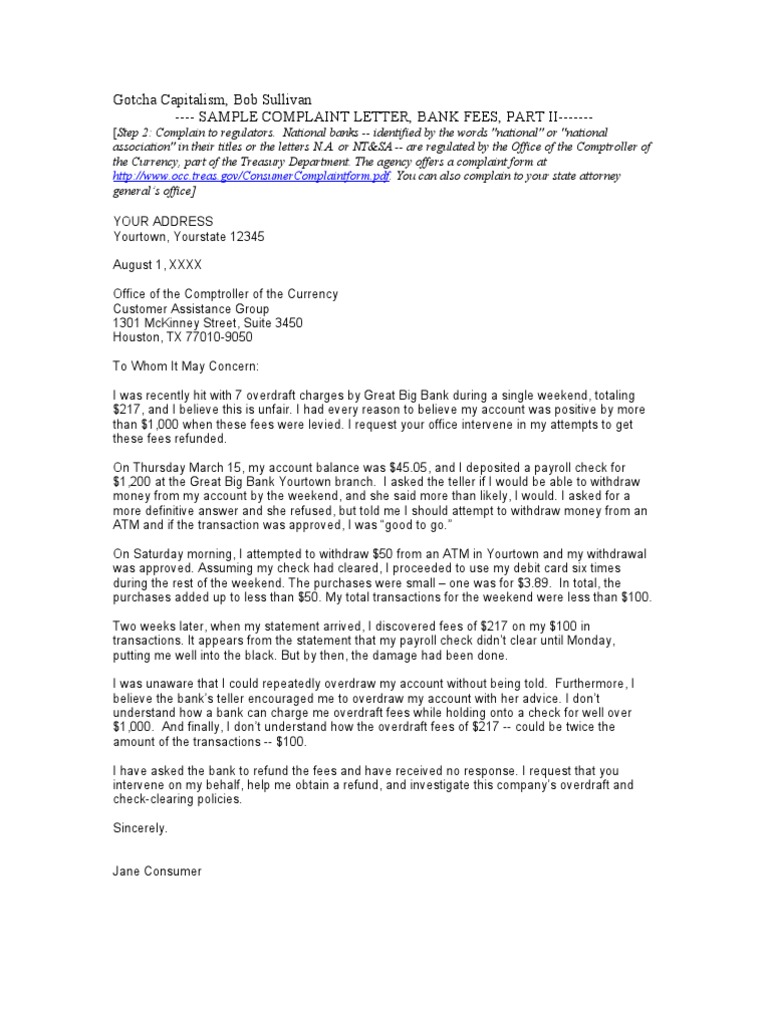 Sample Complaint Letter Bank Fees Ii Overdraft Cheque